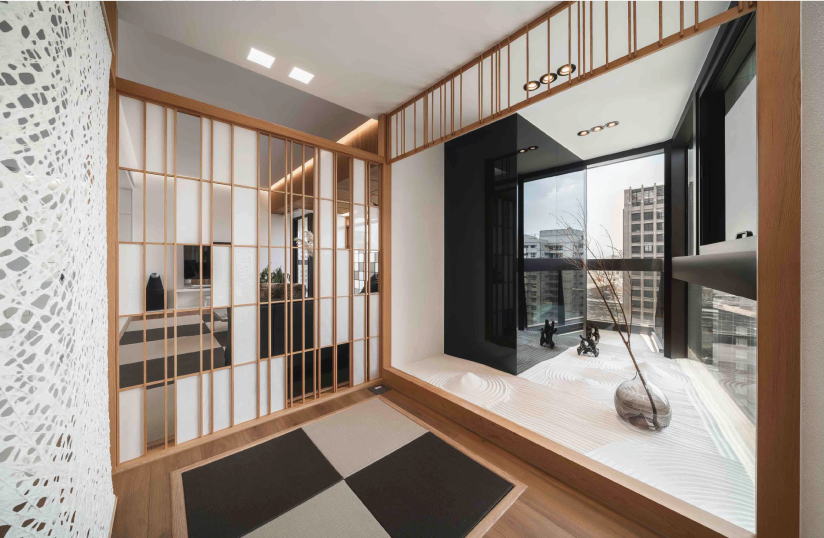 正面の建具は、組子を不規則に配置すると共に隣の空間が見えるようデザイン。