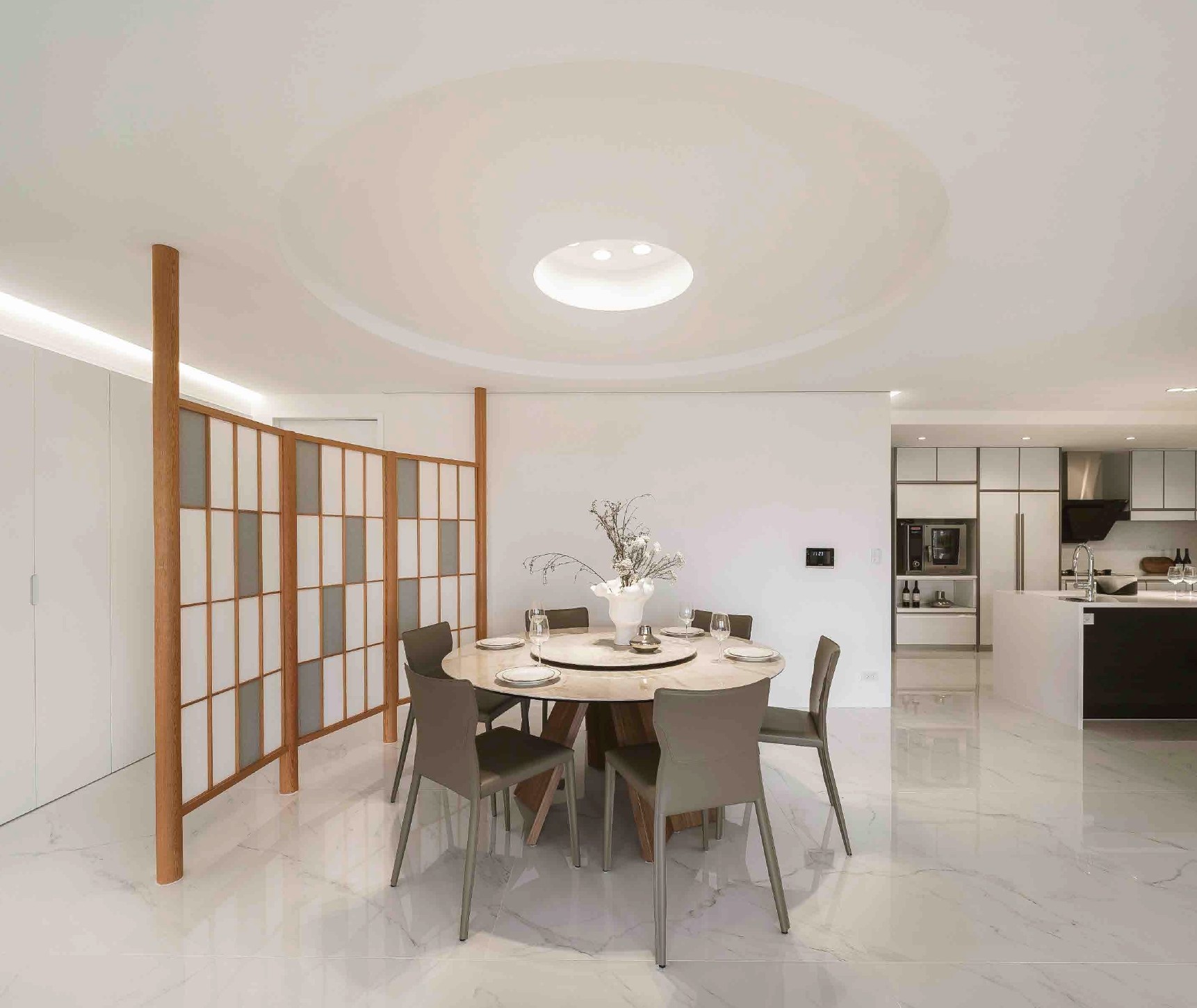 円卓左手の建具は、屏風の変形。白色とグレーの千鳥模様を採用。